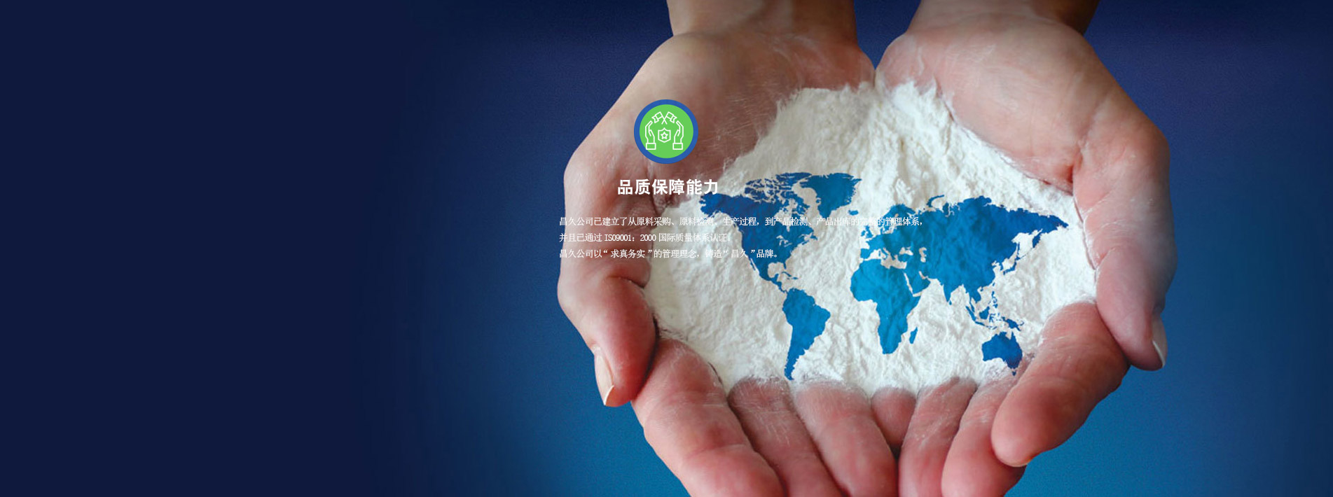昌久公司已建立了從原料采購、原料檢測、生產過程,到產品檢測、產品出庫的完整的管理體系,并且已通過IS09001:2000國際質量體系認證。昌久公司以"求真務實"的管理理念,鑄造"昌久"品牌。